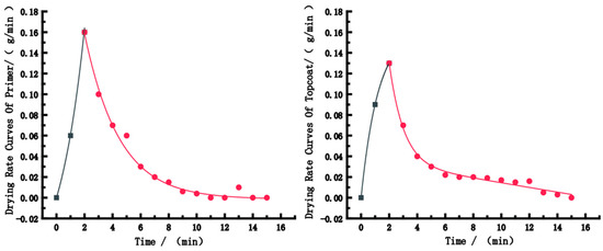 - The drying rate curves of the primer and topcoat coatings are established. The two curves are similar; they both first increased, reached their maximum at 2 min and then decreased, finally tending to 0 m/s. The drying rate of the primer was faster than that of the topcoat, and the maximum value was greater than that of the topcoat.
