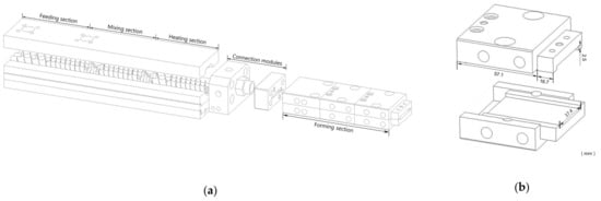 Schematic drawing of (a) the twin-screw extruder comprising a screw section (feeding section, mixing section, and heating section), connection modules, and a forming section; (b) the forming section composed of cooling die units.