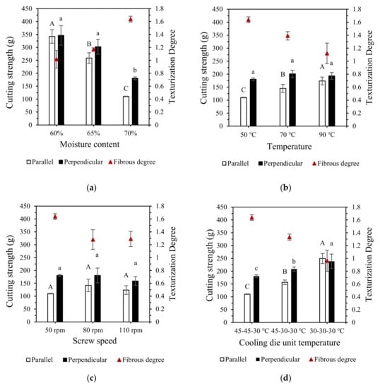 Cutting strength and texturization degree of the extrudates under different processing conditions as well as the three aquatic products: (a) moisture content, (b) extrusion temperature, (c) screw speed, (d) cooling die unit temperature and (e) aquatic product. Different letters indicate significant differences (Least Significant Difference test, p < 0.05) between mean values (±SD, n = 3).