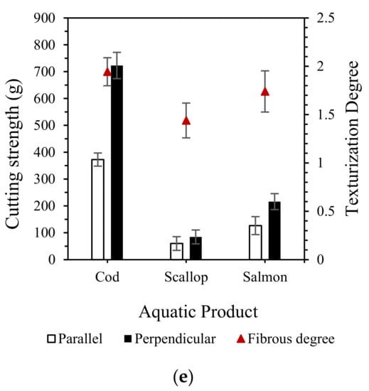 When the extrudate was compared to the aquatic products, the cod and extrudate had similar hardness at 60% moisture content, and the salmon and extrudate had similar hardness at 65–70% moisture content (Table 2). All three aquatic products had lower springiness than the extrudate. The cod and extrudate had similar chewiness at 70% moisture content. The cutting strengths of the cod in the perpendicular and parallel directions were up to 700 g and 300 g, respectively (Figure 2e). It also had a high fibrous degree of 1.94. The fibrous degree and cutting strength of the scallop were slightly lower than that of the extrudate at 70% moisture content. The fibrous degree and cutting strength of the salmon were close to those of the extrudate at 70% moisture content.