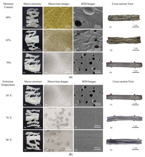 In the moisture content of the 60~70% range, the extrudates showed smaller fibers and a whiter appearance with increasing moisture content (Figure 3a(A1–A3)). At 60% moisture content, the extrudate was transparent and had an anisotropic structure upon tearing, but lacked tiny fibers (Figure 3a(A1)). Decreasing the moisture content reduced the number of bubbles and increased the bubble size (Figure 3a(B1–B3,C1–C3)). This may be because a lower moisture content allows the premixed material to form larger clumps, which leads to larger voids in the melt. The cross-section view shows a V-shape morphology, elongated in the flow direction and becoming parallel when the moisture content was increased (Figure 3a(D1–D3)). The V-shape at 60% moisture content indicates flow instability, which is in line with the results shown in Figure 2a. With increasing moisture content, the fibrous degree of extrudates was higher and the fibrous structure was more parallel.
