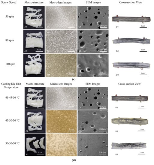 Figure 3 shows macro-structure, macro-lens images, SEM images, and cross-section images of the calcium caseinate extrudates under different experimental conditions. The SEM images show the morphology of air bubbles inside the extrudate. A digital camera equipped with a macro-lens was used to corroborate observed trends over a wider view.