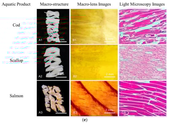 The macro-structure of the scallop was similar to that of the extrudate at 60% moisture content, and the macro-structure of the cod was similar to that of the extrudate at 65% and 70% moisture contents (Figure 3e(A1,A2)). The presence of connective or adipose tissues can be seen in the macro-lens images. They prevent the formation of long muscle tissues in cod and salmon, which also have no air bubbles (Figure 3e(B1–B3)). The micro-structures of the aquatic products were further observed with light microscopy (Figure 3e(C1–C3)). In comparison, the extrudate does not show a fibrous structure at the micro-scale according to the SEM images, only bubbles that deform in the flow direction. Thus, although the calcium caseinate extrudate is similar to the aquatic products in terms of the macro-structure and textural properties, the microstructure is quite different. The extrudate has too many air bubbles and lacks a microstructure. This may help explain why meat analogs produced with extrusion are consistently less flavorful than real meat.