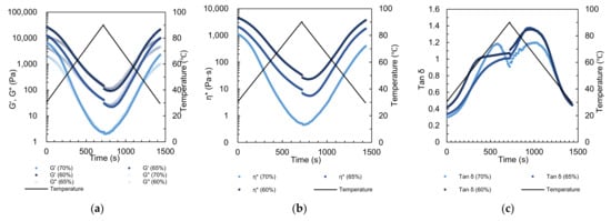 Calcium caseinate premixes at moisture contents of 60%, 65%, and 70% during temperature sweep experiments: (a) storage modulus (G′) and loss modulus (G″), (b) complex viscosity (η*), and (c) loss factor (tan δ).