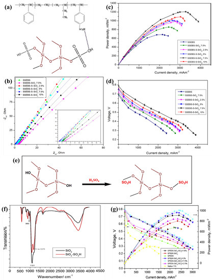 (a) A graphical representation of SSEBS polymer and sSiO2 inorganic filler interaction. (b) Nyquist plots, (c) power density, and (d) polarization curves of SSEBS, SSEBS/SiO2 (7.5%), and SSEBS/sSiO2 (2.5, 5, 7.5, and 10%) membranes. Reproduced from [104], with permission from Elsevier, 2016. (e) Preparation of sSiO2, (f) FT-IR of SiO2 and sSiO2, and (g) polarization curve and power density of Nafion 115, SPEEK, SPEEK-SiO2, and SPEEK-sSiO2 membranes. Reproduced from [105], with permission from Elsevier, 2015.
