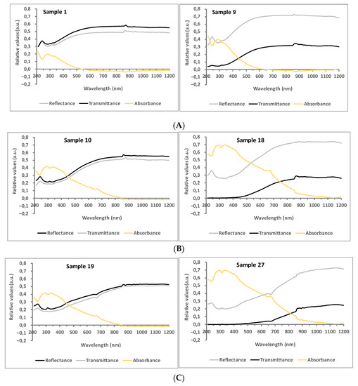 - Walnut-coloured satin samples at level III of relative fabric density (Figure 4) have the lowest transmittance, followed by beet-coloured and raw woven samples in the UV region. The difference in transmittance regarding the colour is more evident in the VIS region. In contrast, the difference is decreased in the IRA region, and from 1100 nm, there is only a slight difference between coloured samples;