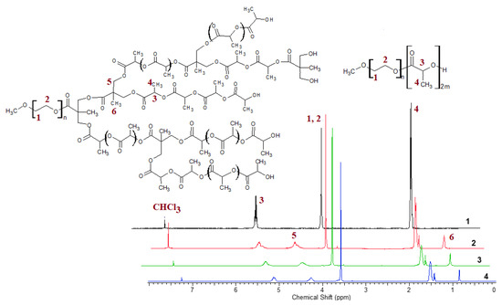 The structure of the synthesized linear and branched pegylated copolylactides was confirmed by 1H NMR spectroscopy; the assignment is shown in Figure 2 and is consistent with the literature data [28,44,52].