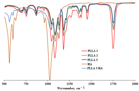 The IR spectra of the PLLA 1, PLLA 2, and PLLA 3 samples, shown in Figure 3, contained all the signals characteristic of copolylactides [53], and were close to the IR spectra of the PLLA 4 and PLLA 5 samples. At the same time, filling with hydroxyapatite lead to the appearance of characteristic absorption bands in the 500–700 cm−1 region.