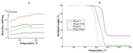 The thermal transitions of the prepared PLLA blends were assessed by DSC experiments. Typical DSC thermograms of PLLA 1, PLLA 1 HA, PLLA 5, and PLLA 5 HA composites (second heating run), are given in Figure 4. The designations of the obtained samples of polyester composites, as well as their compositions and thermal properties, are given in Table 3.