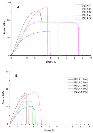 Figure 5. Tensile test curves for PLLA films without (A) and with (B) addition of 20 wt% of hydroxyapatite.