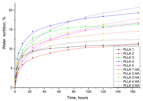 Figure 7. Kinetic curves for water absorption by different PLLA film samples.