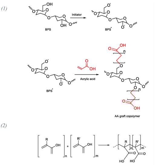 A radical polymerization reaction between an acrylic acid monomer and BPS was carried out. A graft copolymer with a defined backbone and randomly distributed branches or side chains different from the main chain was obtained. The possible synthesis reaction of the new BB graft copolymer is shown in Figure 1(1) and the acrylic acid radical polymerization is shown in Figure 1(2) [,] In order to better understand the radical polymerization, acrylic acid is marked in red.