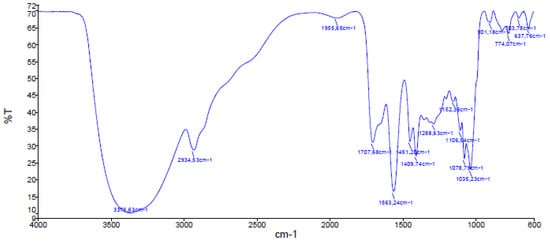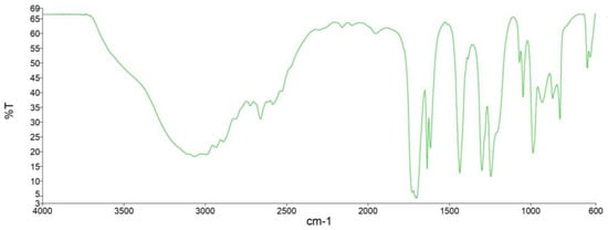 IR spectra data allowed the identification of the functional groups that characterize polymers and their constituent monomers. IR spectra of sustainable acrylic resin BB and of acrylic acid are shown in Figure 2 and Figure 3, respectively. The main absorption bands of the functional groups present in acrylic acid were identified. The band of the –OH bond of the carboxyl group appeared at 3063 cm−1, followed by the CH2 band at 2661 cm−1. The C=O group band appeared at 1704 cm−1, the C–H band appeared at 1434 cm−1, and the doublet appeared at 1298 cm−1 and 1243 cm−1 due to C–O bond stretching from esters [].
