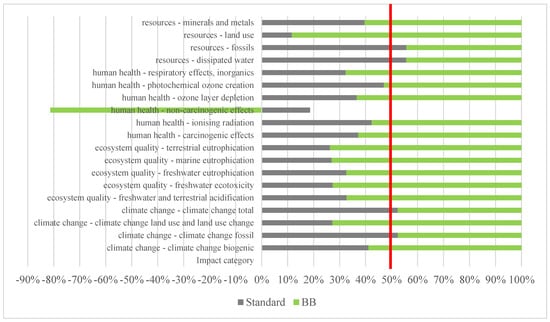 Biopolymer BB has a greater environmental impact in the categories related to (non-fossil) natural resources, toxicity parameters, and human health. This is due to sugarcane cultivation, the origin of the polysaccharide derivative. Sugarcane cultivation has a high environmental impact due to the high use of fertilizers, herbicides or pesticides, which increase eutrophication, acidification, or waters with low concentrations of dissolved oxygen [,,,,]. Moreover, because sugarcane is burnt to facilitate harvesting, it releases greenhouse gases that impair human health and pollute the air []. In turn, the standard resin has a greater impact in all the categories related to fuels and fossil resources, which are obtained from petroleum. In general, a greater impact of BB in 14 of the 19 categories selected was observed. In the non-carcinogenic effect category, BB was much better than the standard acrylic resin because sugarcane cultivation uptakes Zn, Cu and Ni. BB was also better than the standard resin in the climate change and carbon footprint categories, reduced by 9%.