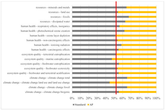 On account of the high environmental impact of the polysaccharide derivative, a sensitivity analysis was performed where the polysaccharide derivative was replaced with a protein derivative (AP). The results are shown in Figure 5 as a stacked bar chart with 50% contribution as red line.