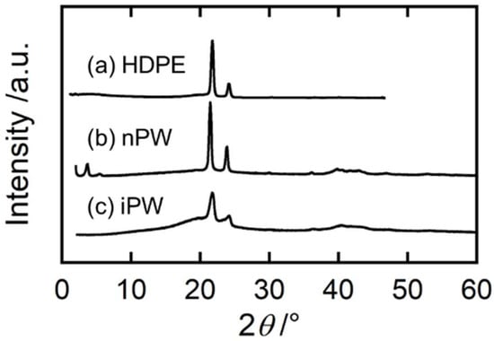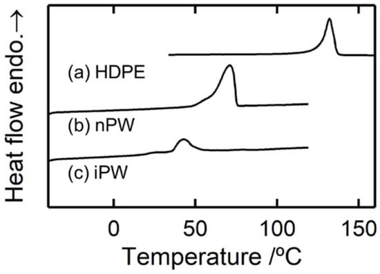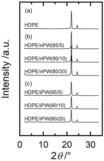 Figure 1 shows the wide-angle X-ray diffraction (WAXD) profiles for HDPE, nPW, and iPW. The main crystal structure of HDPE and both solid paraffins was orthorhombic. The nPW exhibited considerably high crystallinity with almost no amorphous halo, whereas the iPW exhibited a broad amorphous halo, indicating low crystallizability [14,25].