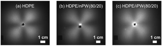As well known, almost crystalline polymers prepared from the melts show spherulite structure which consists of crystalline lamellae composed of folded chain crystallites. The amorphous regions reside in the interlamellar regions and a number of tie chains linking between adjacent crystalline lamellae exists within the amorphous layers. Moreover, the spherulite is filled with the stacked lamellae in such a way that a constant degree of crystallinity is maintained. Figure 3 shows the pictures of the SALS patterns of the HDPE, HDPE/nPW (80 w/20 w), and HDPE/iPW (80 w/20 w) sheets. The similar scattering patterns were also observed for other blends. The four-leaf clover pattern reflects a typical spherulite structure. Based on the scattering patterns, the spherulite radius values were estimated to be about 2.0 μm, except for HDPE/nPW (80 w/20 w), which had a radius of 2.7 μm. The addition of solid paraffins limitedly affected the crystallization process of HDPE. However, a large amount of nPW enhanced the spherulite size, suggesting that nPW can act as secondary nuclei for spherulite growth. As another factor, Chen et al. [28] pointed out that the presence of 30% solid paraffin led to a PE crystal imperfection on the spherulite structure in HDPE due to the crystallinity and polarized optical microscopy.