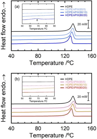 Figure 4 summarizes the WAXD data for the HDPE blends. Orthorhombic crystals were observed in all samples. Moreover, adding both paraffins only slightly affected the diffraction patterns of the HDPE. Figure 5 shows the DSC curves for the HDPE as well as HDPE/nPW and HDPE/iPW blends. iPW addition did not affect the DSC curve of HDPE. However, in addition to the peak corresponding to the melting point of HDPE, nPW addition exhibited a slight peak at around 70 °C, corresponding to the melting point of nPW (Figure 5, inset). These results suggest that iPW showing lower crystallizability was not crystallized in the HDPE matrix. Conversely, nPW showing considerably higher crystallizability was partially crystallized in the HDPE matrix. The nPW nuclei or crystallites that evolved during blending may have caused HDPE spherulite growth through heterogeneous nucleation. The melting point of HDPE for both blends decreased slightly with increasing PW content (Table 1). The decrease in the melting point possibly resulted from a diluent effect according to Raoult’s law [29]. Consequently, it was suggested that the iPW molecules are completely dissolved in the amorphous phase of HDPE, whereas nPW molecules are also incorporated in the amorphous phases, but a part of nPW molecules forms crystalline domains.