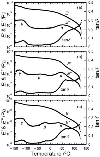 Dynamic mechanical spectra provide us with the fundamental characteristics of viscoelastic materials such as polymeric materials. It is well known that various PE-based materials have three relaxations in the temperature dependence of the dynamic mechanical moduli, identified conventionally as α, β, and γ in order of decreasing temperature. The α relaxation is observed in the range between room temperature and the melting temperature, β relaxation is observed around −20 to −30 °C, γ relaxation is observed at about −120 °C. The α relaxation is ascribed to the molecular motion in the crystalline phase and the γ relaxation is associated with the local molecular motion. The β relaxation is absent for HDPE with thin amorphous layers but is well identified for short-chain branched PE and ultra-high molecular weight PE with thick amorphous layers [5,6,7,8]. The β relaxation is sensitive to the molecular motion within amorphous layers. The existence of β relaxation strongly affects the mechanical properties such as toughening, impact resistance, and drawability.