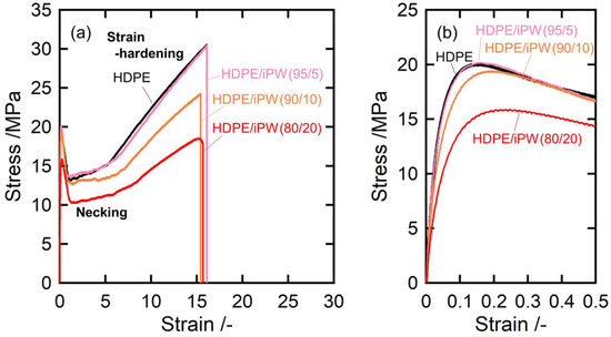 Stress–strain curves of HDPE and the HDPE/iPW blends: (a) overall view of the stress–strain curves and (b) the stress–strain curves in the yield deformation region. The numerals in parentheses denote the weight fractions of HDPE and solid paraffins.