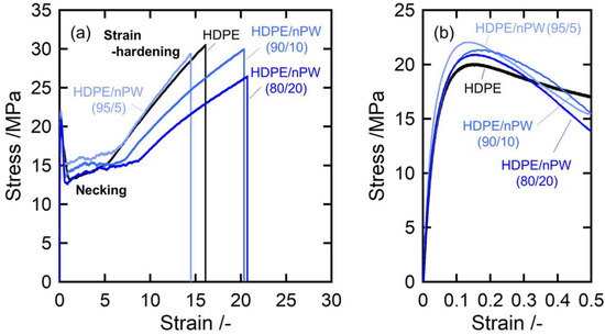 Stress–strain curves of HDPE and the HDPE/nPW blends: (a) overall view of the stress–strain curves and (b) the stress–strain curves in the yield deformation region. The numerals in parentheses denote the weight fractions of HDPE and solid paraffins.