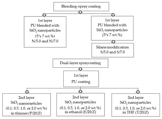 Silica nanoparticles (particle size of 20–30 nm) were blended into the coating solution with varied loading (5 wt.% or 7 wt.%) as summarized in Figure 1. The silica nanoparticles were first dispersed in the thinner using an ultrasonicator operated for 30 min. The thinner solution containing silica nanoparticles was then mixed with paint and hardener for 5 min using a planetary mixer. The coating solution was spray coated on the glass slides and cured for 5 h at 50 °C. These samples were labeled as N/Z, where Z represents the silica loading (wt.%).