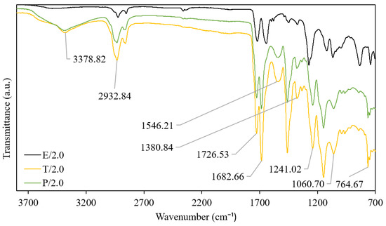 FTIR spectra of dual-layer PU coating with 1.0 wt.% of silica nanoparticle in different solvents (ethanol—E/1.0, THF—T/1.0, paint thinner—P/1.0).