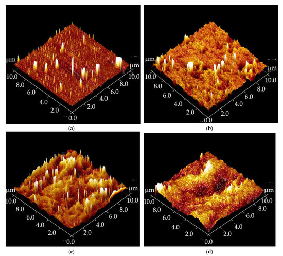 The average roughness in AFM images of (a) PU coating without modification (R-0: 4.15 nm), and (b) PU coatings modified using silica in ethanol (E/1.0: 13.4 nm), (c) THF (T/1.0: 6.11 nm), or (d) paint thinner (P/1.0: 15 nm).