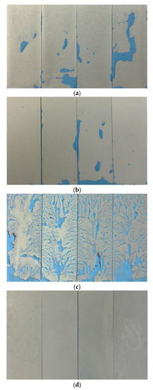 The antifouling properties of the coating surfaces were further studied using the kaolinite slurry solution blended with dye as the simulated contaminant. The image was analyzed using ImageJ so that the fouling could be quantified and compared precisely. Figure 6a–d shows the fouling areas of the PU coating (R-0), PU coating blended with silica nanoparticles (N/7.0), silane-modified PU coating blended silica nanoparticle (S/7.0), and dual-layer coating with PU and silica nanoparticles in paint thinner (T/1.0) before and after the fouling test.