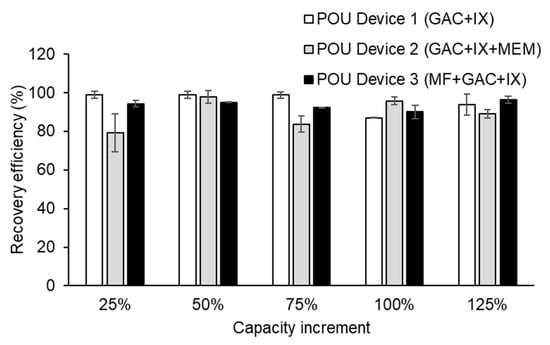 Mean particle recovery following each 1 L sample filtered through duplicates of POU Device 1 (GAC + IX), POU Device 2 (GAC + IX + MEM), and POU Device 3 (MF + GAC + IX). Vertical bars represent ± one standard deviation (n = 2).