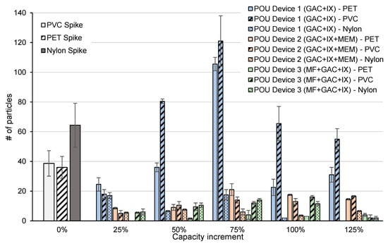 The mean effluent MP particles for each of the three polymer types and POU devices as a function of rated treatment capacity are shown in Figure 3. POU Device 1 (GAC + IX) exhibited inferior performance with respect to the removal of PET and PVC fragments, where PET particles in the effluent exceeded the influent at 75% of the rated capacity and PVC at 50–125%. The observed increase may potentially be attributed to the accumulation and release of trapped particles. In contrast, the nearly complete removal of nylon fibers was achieved when the capacity reached 100% for POU Device 1 (GAC + IX). These results suggest that the POU devices that only incorporate GAC and IX may not effectively remove microplastics, despite meeting ANSI and NSF health-based performance certifications. GAC and IX are typically employed for the chemical adsorption of organic and ionic contaminants and not the physical removal of particulates [32,33].