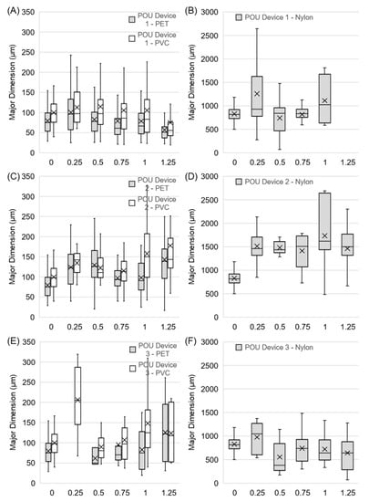 Change in size distribution of the major dimensions of PET, PVC, and nylon microplastics as a function of the increasing rated treatment capacity for all three POU devices. X represents the mean and lines represent the maximum, 3rd quartile, median, 1st quartile, and minimum values, from top to bottom.