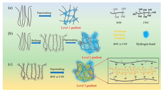Fiber gradient reinforcement mechanism diagram. (a) Level one gradient skeleton support network formed by WPF fibers. (b) Level two gradient reinforced structure formed by WPF after pulping and papermaking. (c) Level three gradient-enhanced mesh structure formed by mixing FWF and BNF/CNF for papermaking.