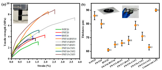 (a) Mechanical property curve of paper-based electrode; (b) Electrodes thickness.