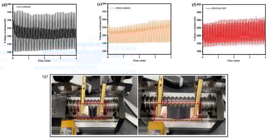 To further analyze the change in paper-based electrode resistance during bending deformation, the bending–stretching sensing test of the bulk resistance was carried out [35]. Figure 6a–c shows that the change range of body resistance of FWF15-BNF5 and FWF15-CNF5 is smaller than that of FWF20 within 1 min of bending–stretching, and the body resistance sensing signal of FWF15-BNF5 is more regular than that of FWF15-CNF5 during bending deformation, while the sensing signal of FWF15-CNF5 shows more miscellaneous peaks during 4 min of bending–stretching sensing test (Figure 6d–f). It shows that the lower body resistance fluctuation of FWF15-BNF5 in the bending deformation state is small and stable, which is more conducive to its application in the field of flexible electrode materials [36].