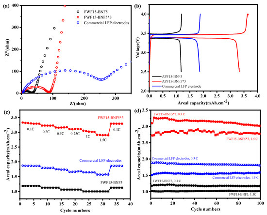 The Nyquist curve of electrode material in Figure 8a shows that the semicircle of FWF15-BNF5 single electrode and FWF5-BNF5*3 three-layer superimposed electrode is smaller in the high-frequency region than that of commercial LFP electrode, but the slope in the low-frequency region is larger, indicating that this self-supporting paper-based electrode has smaller charge transfer internal resistance and higher ion diffusion efficiency, which is helpful to improve the electrochemical performance of the battery [40]. Figure 8b is the first charge–discharge curve of a button cell assembled with different electrode materials at a voltage range of 2.5–4.0 V and a current density of 0.22 mA cm−2 (0.1 C). It can be seen that the first discharge plateau voltage of paper-based electrode materials is stable at about 3.35 V, which is equivalent to that of commercial LFP electrodes, and the polarization is small. The discharge areal capacity of FWF15-BNF5 is 1.2 mAh cm−2. The discharge areal capacity of commercial LFP electrode is 1.9 mAh cm−2, while that of FWF15-BNF5*3 is 3.3 mAh cm−2, which is higher than that of commercial LFP electrode and 2.8 times that of FWF15-BNF5. It shows that the stacking process of the paper-based electrodes can improve the first charge and discharge areal capacity of the electrode, and the capacity loss after stacking is small. As can be seen from Figure 8c, with the increase in current density, the surface capacities of FWF15-BNF5, FWF15-BNF5*3 paper-based electrode, and commercial LFP electrode all decrease slightly and remain stable under different current densities. The discharge areal capacity of FWF15-BNF5*3 is better than that of commercial LFP electrode, and the paper-based electrode also shows good rate of performance, at a current density of 1.5 C (3.3 mA.cm−2). Figure 8d is a cyclic graph of a button cell assembled with different electrode materials after charging and discharging for 100 cycles at current densities of 0.3 C (0.66 mA cm−2) and 1.5 C (3.3 mA cm−2). It can be seen that the FWF15-BNF5 and the commercial LFP electrodes do not decay after 100 cycles, and the capacity retention rate is high, while the FWF15-BNF5*3 electrode slightly decays during the cycle. However, the overall areal capacity is still higher than that of the commercial LFP electrode, and the areal capacity is 3.0 mAh cm−2 and 2.8 mAh cm−2 after 100 cycles of charge and discharge at current densities of 0.3 C and 1.5 C, respectively.