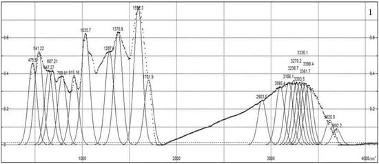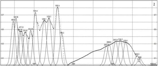 −1, and then inverted to the absorption spectrum; then, it is fitted with Gaussian contours to compare the intensity and reveal offsets. The large number of various functional groups in humic compounds and sampling-dependent IR light dispersion do not allow us to rely on the registration of IR spectra with a high resolution. The peaks obtained as a result of the approximation belong to the following functional groups. A broad absorption band with a maximum in the region of 3000–3500 cm