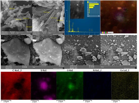 Figure 6 show differences in the shapes of the molecules. The surface of the HA:MWCNTs:M:A composite is rough, uneven and layered; there are agglomerates ranging in size from 98 nm to several microns. Upon further magnification of the micrographs, it becomes clear that these agglomerates consist of elongated tubes approximately 100 nm thick and a micron long, which are part of the composite. At the same time, spherical molecules are present, as well as medium and large aggregates of molecules of various shapes. The layered structure of the composite is explained by the stepwise copolycondensation of the pre-polymerization complex with a nitrogen-containing compound. On the surface of the composite, areas were found that differed in their phase compositions. This can be explained by the fact that, in these areas, the molecules of the composite are stretched over the surface, forming a thin monomolecular layer due to the formation of cationic bridges between the composite and the surface. EDS map data confirm that the main components of the composite (HA:MWCNTs:M:A) are carbon and oxygen, and there are inclusions of silicon, nitrogen and copper. The surface of the composite (HA:MWCNTs:A,