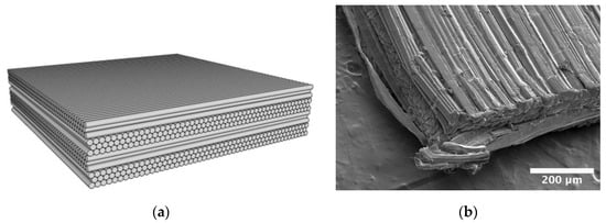 There are several advantages to flexible UD composite laminates compared to traditional woven material. Flexible UD laminates have been shown to absorb more energy per unit panel weight [,,], with similar applications and flexibility as woven fabrics []. In addition, UD composite laminates with UHMMPE or PPTA fibers have been shown to perform significantly better in out-of-plane compression compared to woven materials []. Either UHMMPE or PPTA fibers can be used in combination with an elastic resin material (20% or less by mass) [] that can penetrate to the filament level and hold the fibers together to form a non-woven unidirectional (UD) tape. Layers of the unidirectional tape are laminated together in a crisscross pattern, where each layer is placed at a 90° angle from the layer above and below to form a panel, as depicted in Figure 1, where there are four such UD layers. Unidirectional fiber composite materials can vary significantly based on their intended application. Composites developed for aerospace applications can be hundreds of fibers thick with a high matrix volume fraction up to 50% [], whereas in body armor applications, each layer has a thickness of less than 10 fibers (as can be seen in Figure 1) with lower matrix volume fractions due to the near-hexagonal packing arrangement of the fibers [].