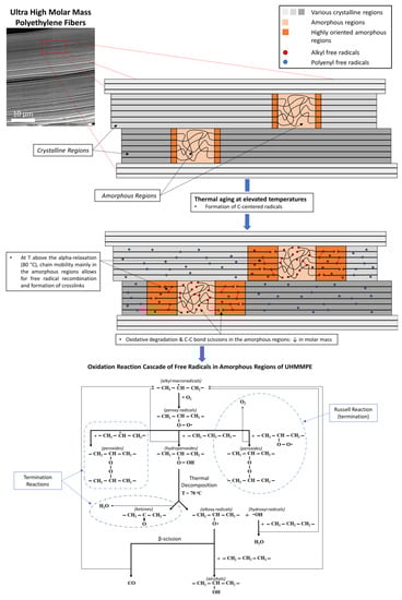 Thermal oxidation of UHMMPE fibers. Schematic of the crystalline and amorphous regions within the polymer fibers; formation of free radicals and the cascade of oxidation reaction in the amorphous regions.
