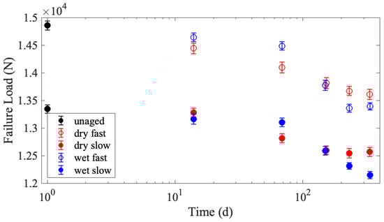 All data associated with this publication is archived through the NIST Public Data Repository []. Specimens of the UD material were cut 70 mm wide, aged at two different humidity levels for the periods previously described, and tested at two different crosshead displacement rates. Figure 5 is a plot of the average failure load, also referred to as the strength, with at least 50 specimens per testing condition. Specimens tested at the faster loading rate of 250 mm/min are plotted with open markers, while specimens tested at the slower loading rate of 2 mm/min have filled markers. The color red and term ‘dry’ is used to indicate that the specimens were aged at 70 °C in a desiccator, while the blue color and term ‘wet’ indicates aging at 70 °C and 76% relative humidity. The error bars in Figure 5 are the standard deviation of the mean failure load retention divided by the square root of the number of specimens. The failure load decreased after exposure to elevated temperatures, as seen in Figure 5. This is indicative of degradation, although the percent degradation is less than 10% (9.9% for wet fast, 9.0% for wet slow, 8.4% for dry fast, and 5.8% for dry slow), indicating that the material retains most of its failure load after exposure to these aging conditions.