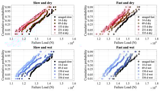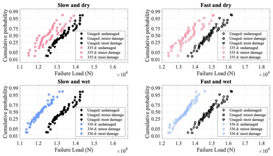 As mentioned in the Experimental Section, the laminate had visible damage. Figure 7 shows the failure distributions for the unaged and most aged conditions, broken down by the amount of visible damage that was assessed prior to aging. While the specimens were initially placed into five different damage categories, these were grouped together for three different classifications for clarity of display on the figure. In general, for the aging conditions shown in Figure 7 as well as the ones not pictured, there are no significant differences between the failure distributions at the different damage levels. Of all the aging conditions, the dry 335 d specimens show some of the largest differences. However, even after 335 d of aging, the curves overlap, showing that the failure load of the most damaged specimens is greater than that of the only minorly damaged specimens. A lack of correlation between visible damage and failure load is consistent with prior observations []. It may be that the only fibers that break due to the visible damage are the weak fibers that would break during loading anyway, thus explaining the invariance of the failure load to damage level.