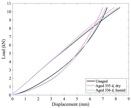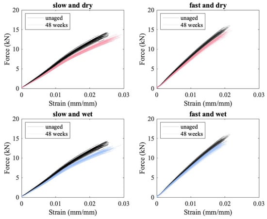 In addition to the failure load decreasing with aging, the modulus also decreases, as can be seen in Figure 8, where the load vs. strain curves for the unaged material are plotted in black, and the aged curves are plotted in red/pink for the specimens aged in a desiccator and blue for the specimens aged at 76% RH. For the specimens subjected to a slow loading rate, there is a clear separation between aged and unaged curves at higher strains (see Figure 8). This decrease in modulus is less pronounced at the faster loading rate, where there is less time for slip and creep to occur. It is not clear how much of a change in modulus would be seen at ballistic rates.