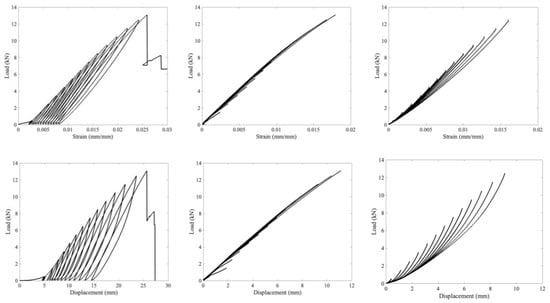 Unaged cyclic-tested specimen with load vs. strain on top and load vs. displacement on bottom. Left plots the whole loading, middle the superimposed loading portions of the curves, and right the superimposed unloading portions of the curves. The curves in the middle and right columns were shifted to start at 0 mm displacement.