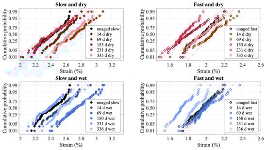 In addition to changes in the failure load and modulus, the failure strain also changes with aging, as can be seen in Figure 12. However, the changes for the failure strain are more complex. The failure strain initially increases with aging at all loading rates and aging conditions, but as aging continued, there became no clear trend for the failure strain. For the fast loading rate, the aged failure strain distribution is sometimes greater than and sometimes less than the unaged distribution, while for the slow loading rate, the strain for the aged material is typically greater than that for the unaged. Some of this variability may be due to measurement error, or it could be that initially the degradation due to aging causes an increased failure strain as only a few fibers are broken; hence, there is simply more slip before failure. At higher levels of aging, there is more damage, so the failure happens sooner, causing either only a modest increase in failure strain or no increase at all.