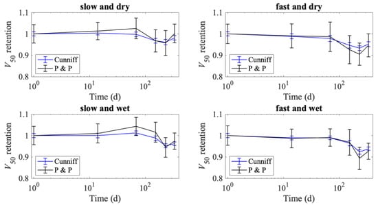 The V50 ballistic performance measure can be calculated from the tensile properties following either Cunniff [] or Phoenix and Porwal [], as described in []. The predicted V50 retention is presented in Figure 13, where mean retention is calculated by scaling the V50 values at various aging times by the predicted initial V50. The error bars in Figure 13 are the coefficient of variation (standard deviation divided by the mean), scaled by the mean initial V50 value. The trends for predicted V50 do not perfectly follow the failure load degradation (seen in Figure 5) as the V50 calculation also takes into account changes in the modulus and failure strain. The Phoenix and Porwal method is more sensitive to failure strain, which is why it fluctuates more than the Cunniff method. For all methods, aging conditions, and loading rates, the drop in predicted V50 is never more than 11%. The largest decrease in predicted V50 values is seen for the specimens tested at the faster loading rates, with the fast and wet specimens having a minimum V50 retention of 0.893 and the fast and dry specimens having a minimum V50 retention of 0.905. In contrast, the specimens tested at a slow loading rate had minimum predicted V50 retentions of 0.957 and 0.945 for the dry and wet conditions, respectively. There is reason to believe that these predictions may be conservative, based on other research [], and that the true reduction in V50 may be even less than that predicted by the Cunniff or the Phoenix–Porwal models.