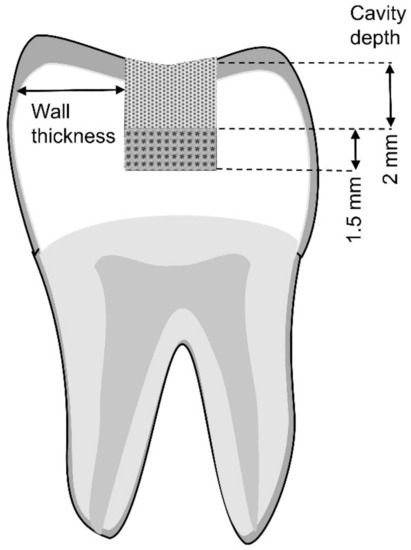 Cavities that require extensive preparation experience an enormous loss of hard dental tissues, which proportionally decreases the strength of the teeth and results in fractures [6]. Preparation involving the mesial, occlusal, and distal surfaces of a tooth are known as mesio–occluso–distal (MOD) cavities. MOD cavity designs can result in up to a 63% loss of cuspal stiffness, weakening the tooth [7]. MOD designs are prone to fracture, especially in the posterior teeth, regardless of the thickness of the remaining walls [8]. The accumulated tooth loss and fragility can be countered by reinforcing the remaining tooth structure. Reducing the interfacial stress concentrations in large composite restorations can reduce cuspal deflection [9,10].