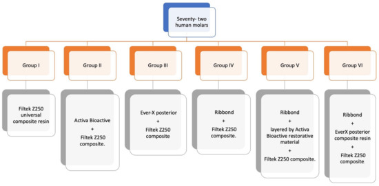 The teeth in the experimental groups (II, III, IV, V, and VI) were restored with different techniques according to the group they were assigned to. Group II was restored using ACTIVA BioACTIVE-Restorative and liner as a dentin substitute, which was layered with the Nanohybrid Filtek Z250 universal composite resin. The bonding protocol was applied according to the manufacturer’s instructions. A 0.5 mm layer of BioACTIVE-Liner was applied on the floor, followed by a layer of the ACTIVA BioACTIVE material to replace the dentin and a layer of the Nanohybrid Filtek Z250 universal composite resin to finish the restoration. Group III was restored with the everX Posterior composite resin in place of dentin, which was layered with the Nanohybrid Filtek Z250 universal composite resin. Group IV was restored with the polyethylene fibers called “Ribbond” (Ribbond Inc., Seattle, WA, USA), which were placed on both axial walls and the cavity floor, layered with the Filtek Z250 universal composite resin. The bonding protocol was applied according to the manufacturer’s instructions. Then, a 0.5 mm layer of a flowable composite resin (Opallis Flow, FGM Dental Group) was placed into the cavity. A small piece of the fiber was wetted with an unfilled bonding resin and embedded into the composite resin layer (0.5 mm away from the external margin of the tooth structure). The fiber was placed on the floor of the cavity and axial walls. The last layer was placed and cured as per the recommended instructions. Group V was restored with polyethylene fibers placed on both axial walls and the floor of the cavity, and layered with the BioACTIVE-Liner and -Restorative as a dentin substitute and with the Nanohybrid Filtek Z250 universal composite resin to finish the restoration. Group VI was restored with polyethylene fibers (Ribbond, Inc.) placed on both axial walls and the floor of the cavity, and layered with the everX Posterior composite resin (GC Corporation) and the Nanohybrid Filtek Z250 universal composite resin.