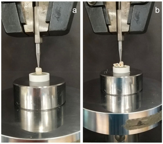 (a) The specimen was subjected to an axial compressive load meant to cause fracturing by using a 3 mm diameter steel ball that contacts the restoration at the center area at a crosshead speed of 0.5 mm/min. (b) Fractured specimen.