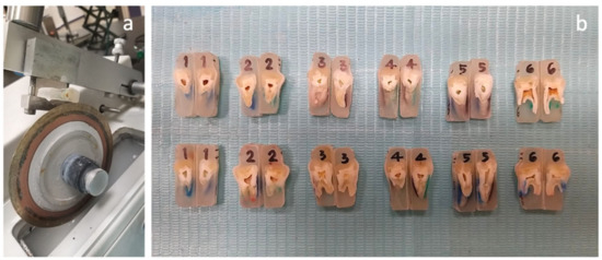 (a) Specimens were sectioned and prepared for scanning electron microscopy (SEM). (b) Labelling the samples according to the designated group (digit placed above).